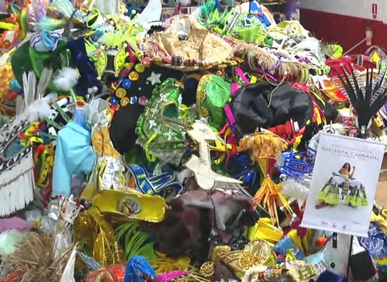 Uma montanha de 23 toneladas de fantasias jogadas fora e de adereços caídos pelo chão na...