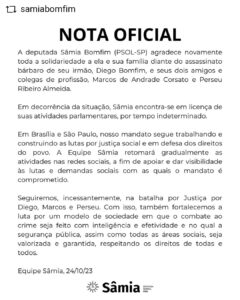 A deputada federal Sâmia Bomfim (PSOL-SP) entrou em licença por tempo indeterminado. Sâmia teve o irmão Diego Ralf de Souza Bomfim assassinado junto com os colegas ortopedistas Marcos de Andrade Corsato e Perseu Ribeiro Almeida no início do mês, em um quiosque na Barra da Tijuca. Segundo a polícia, eles teriam sido mortos por engano.