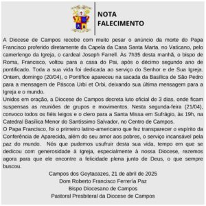 Bispo de Campos decreta luto oficial e convoca fiéis leigos e clero para a Missa