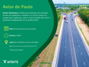 A obra de ampliação e melhorias no trecho urbano da BR 101, em Campos dos Goytacazes, será entregue na próxima terça-feira, dia 19 de dezembro. A informação é da Arteris Fluminense, responsável pela administração dos 322 quilômetros da BR-101 RJ/Norte entre Niterói e a divisa RJ/ES.
