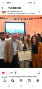 Fui homenageada pelo vereador Maicon Cruz com a Medalha Cidade Campos dos Goytacazes, a quem agradeço pelo reconhecimento. Me senti muito honrada por estar entre os homenageados dessa noite, pessoas com trajetórias inspiradoras que fazem a diferença em suas áreas de atuação e contribuem para o desenvolvimento da nossa região.