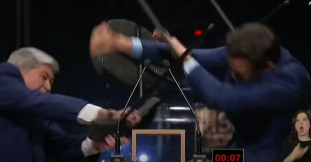 Na sequência, Datena aparece na imagem agredindo Pablo Marçal com o que aparenta ser uma cadeira.