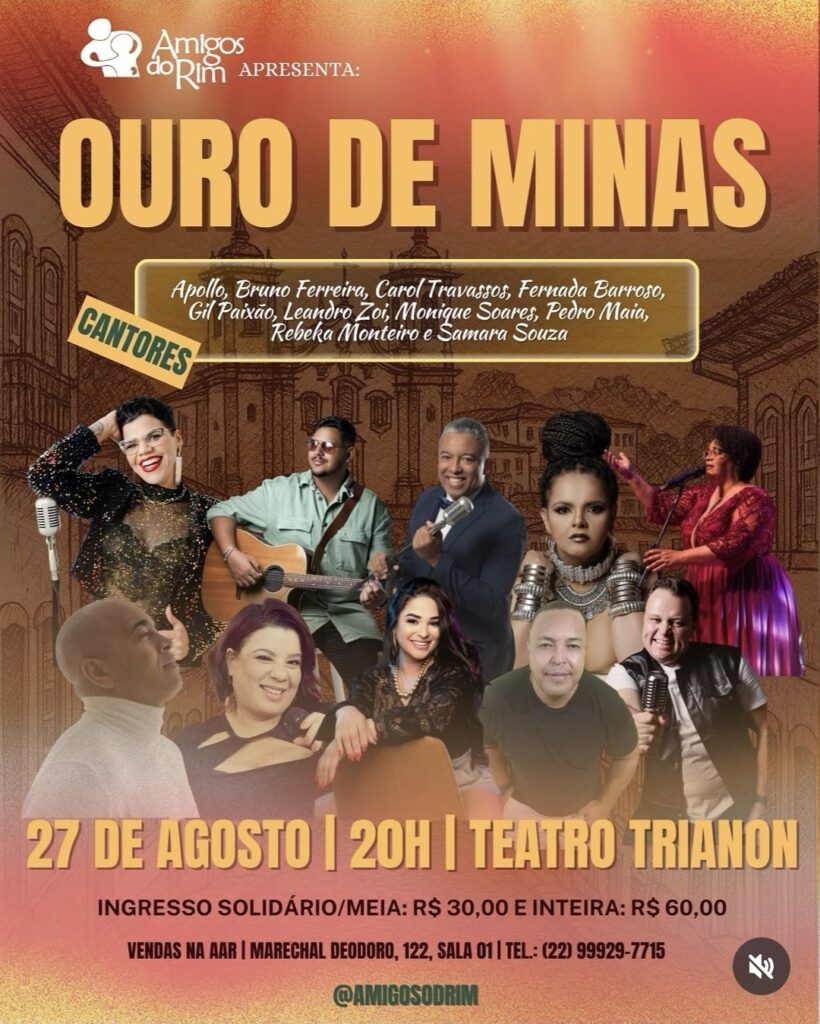 A solidariedade e a música vão se encontrar no palco do Teatro Trianon, em Campos dos Goytacazes, no dia 27 de agosto, às 20h, durante a 11ª edição do espetáculo beneficente promovido pela Associação Amigos do Rim. Intitulado “Ouro de Minas”, o evento promete emocionar o público com apresentações de dez artistas campistas que, de forma voluntária, interpretarão clássicos da música mineira.