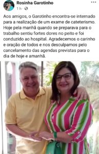 A informação foi divulgada pela ex-governadora Rosinha Garotinho em rede social.