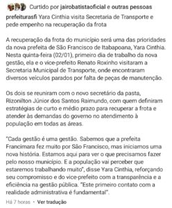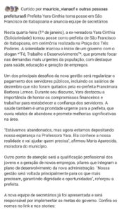 Em outra postagem, sobre problemas na frota, há até uma tentativa de amenizar, ao falar que a antiga prefeita “fez muito”, mas afirma que está sendo iniciada “uma nova história”.