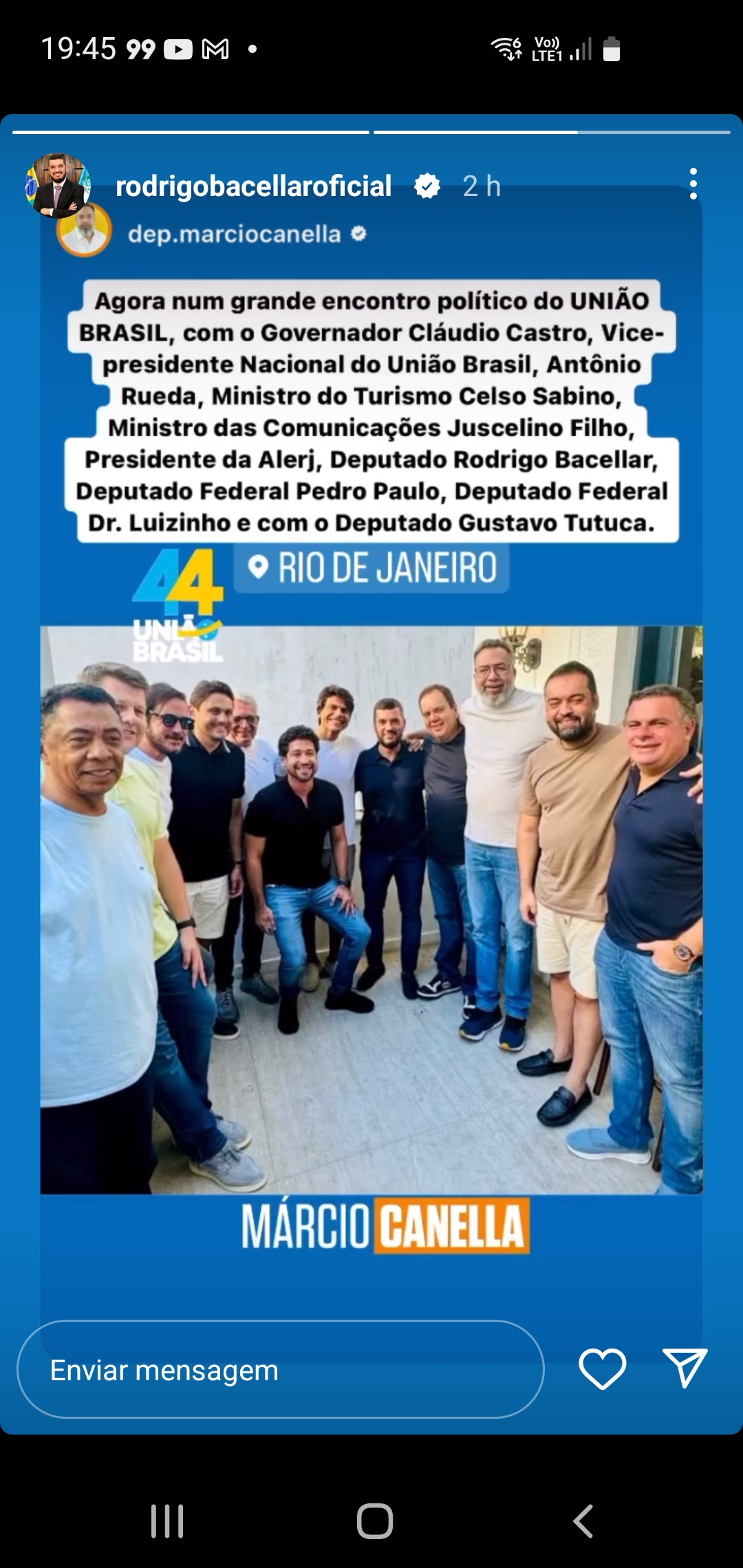 Rodrigo Bacellar chega com força e prestígio ao União Brasil. Um ato pre-filiação do presidente da Alerj, que já é coordenador da legenda, reuniu o governador Cláudio Castro, o vice-presidente nacional do partido Antônio Rueda, dois ministros do governo Lula (Celso Sabino, Turismo, e Juscelino Filho, Comunicações); dois deputados federais (Dr Luizinho e Pedro Paulo, braço direito de Eduardo Paes) e um estadual, Gustavo Tutuca.
