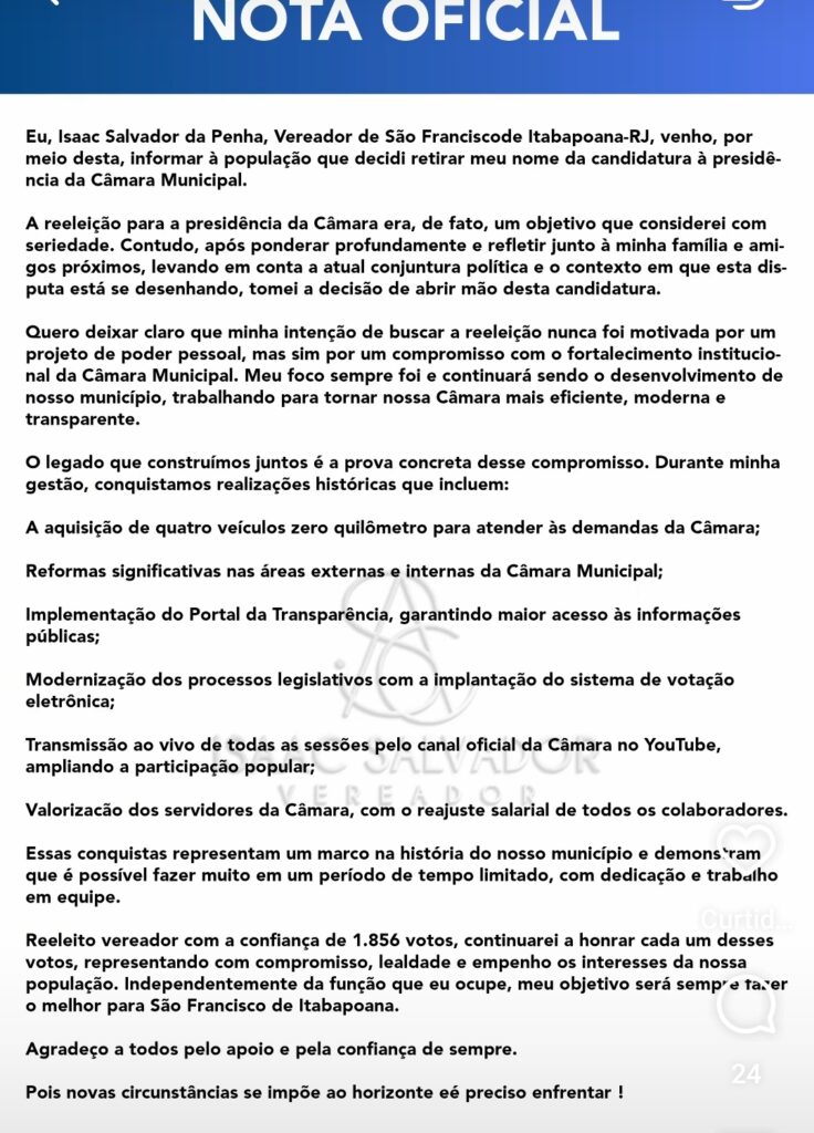 Em São Francisco de Itabapoana, o vereador Isaac Salvador (REPUBLICANOS), atual presidente do Legislativo, anunciou sua desistência da candidatura à reeleição para o cargo. A decisão foi postada em rede social através de nota oficial e motivada pelo “contexto em que a disputa está se desenhando”. (Leia quem é o provável novo presidente após a imagem)