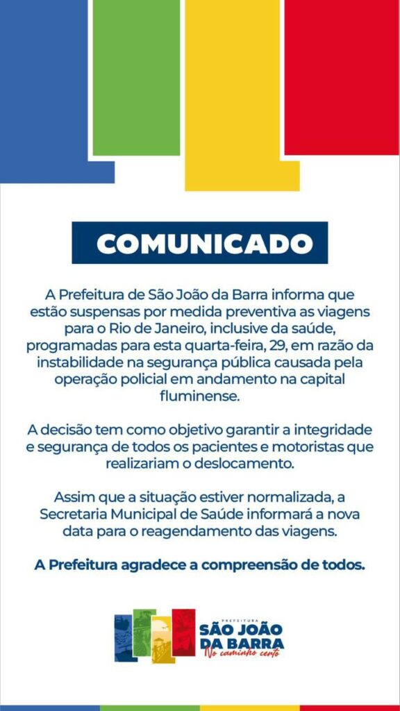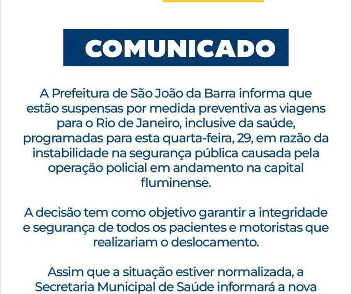 Suzy Monteiro São João da Barra suspende viagens ao Rio nesta quarta, 29, em função da instabilidade na segurança pública 28/10/2025