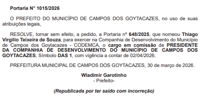 O ex-vereador Thiago Virgílio foi exonerado do cargo de presidente da Codemca. Ele vai disputar uma vaga a Alerj e o prazo de desincompatibilização vai até 4 de abril.