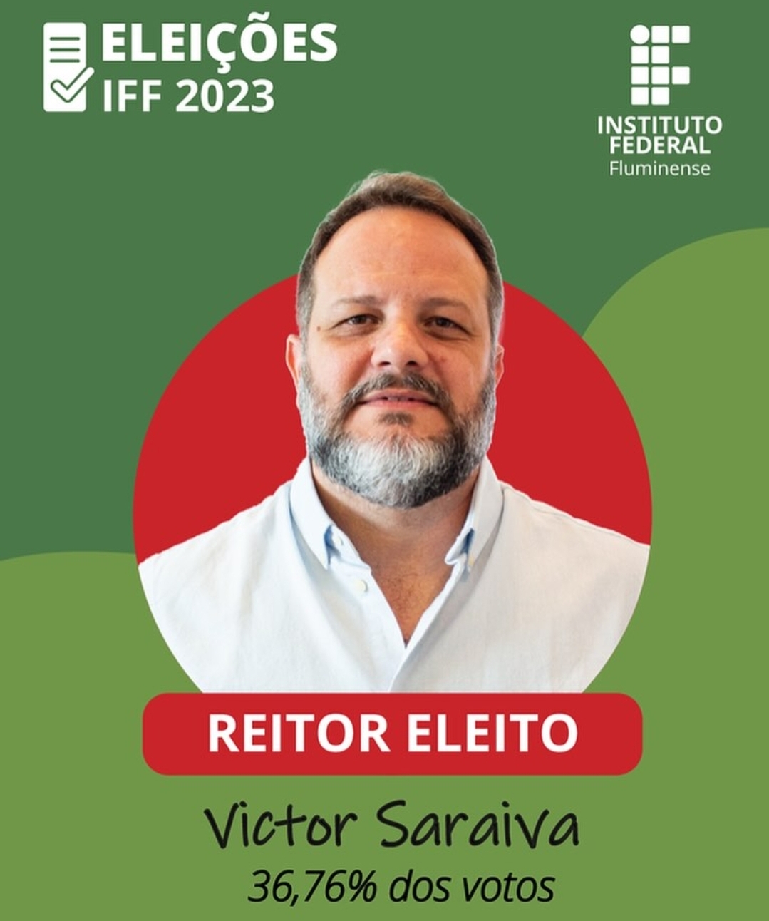 O professor Victor Barbosa Saraiva foi eleito reitor do Instituto Federal Fluminense com 36,76% dos votos, nas Eleições IFF 2023 realizadas nessa quarta-feira (6), em 13 unidades do Instituto, quando também foram eleitos os diretores-gerais de 11 campi. Victor é o atual diretor-geral do Campus Cabo Frio e está eleito para o mandato 2024-2028, substituindo o professor Jefferson Manhães de Azevedo. O candidato Carlos Artur de Carvalho Arêas recebeu 31,02% dos votos.