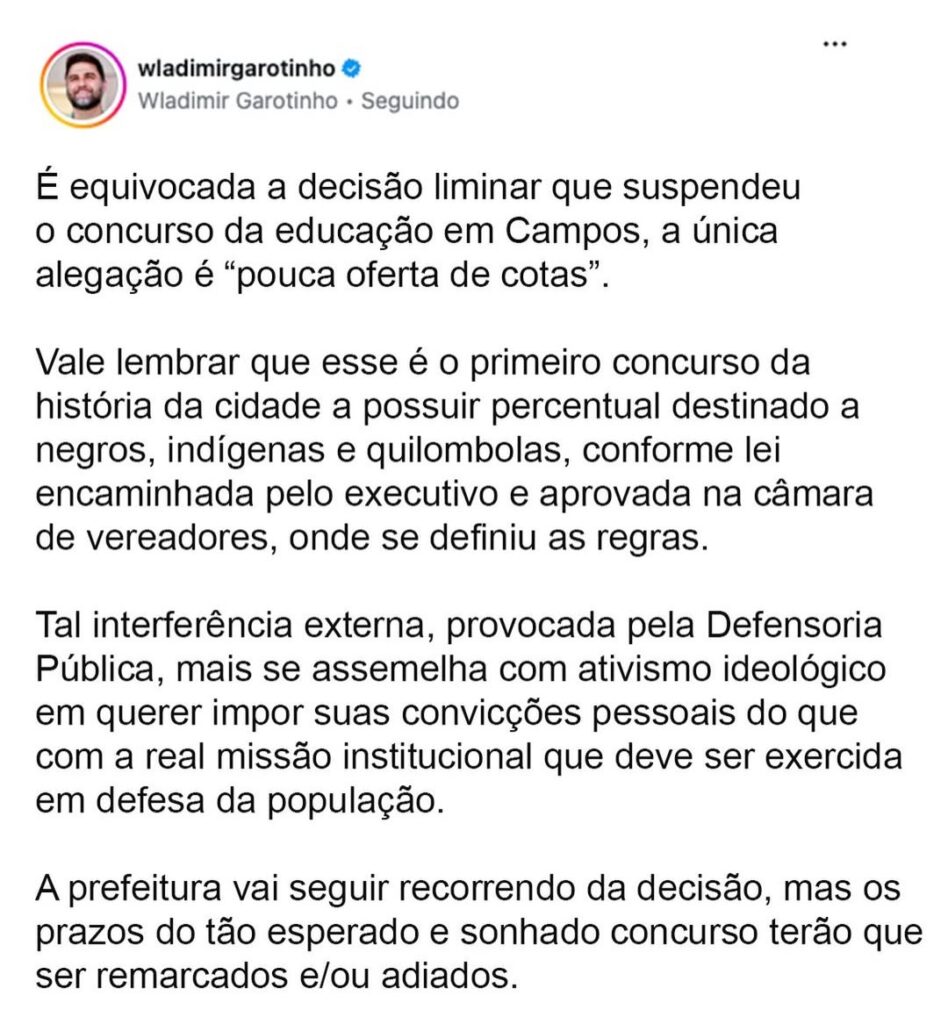 O prefeito Wladimir Garotinho classificou como “ativismo ideológico” a decisão judicial que atendeu pedido da Defensoria Pública e suspendeu o concurso público para a Educação de Campos. A suspensão ocorreu após questionamentos sobre os percentuais de cotas raciais no edital.