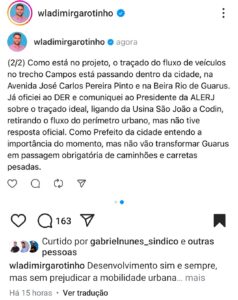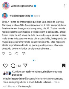 Domingo, 09, o prefeito de Campos, Wladimir Garotinho, postou dizendo entender a importância da obra, mas que já oficiou ao DER e comunicou ao presidente da Alerj sobre o traçado que seria ideal.