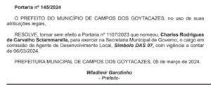 O prefeito Wladimir Garotinho exonerou o (até pouco tempo) companheiro Charles Guerreiro. A exoneração foi publicada em edição suplementar do Diário Oficial dessa terça-feira, 5.